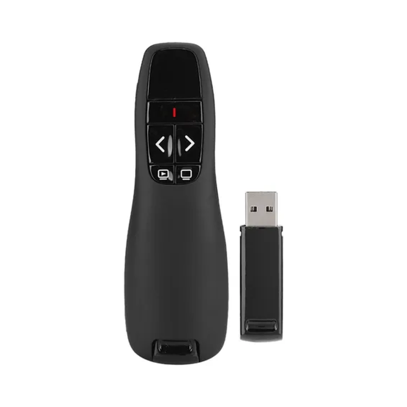 Apuntador inalámbrico R400 con control remoto intuitivo, ideal para presentaciones. Conexión USB, señal estable y alcance óptimo para salas