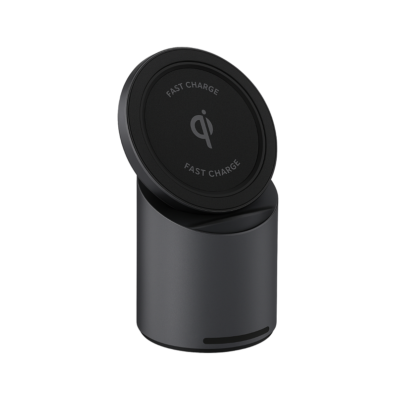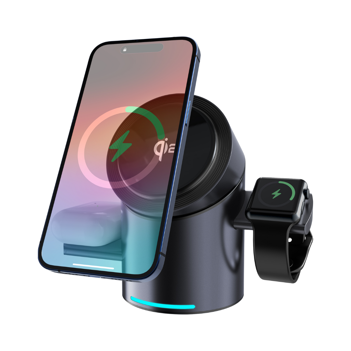 Cargador magnético inalámbrico 3 en 1 Q2 ideal para celular, reloj y audífonos, con carga rápida, diseño moderno y uso práctico.