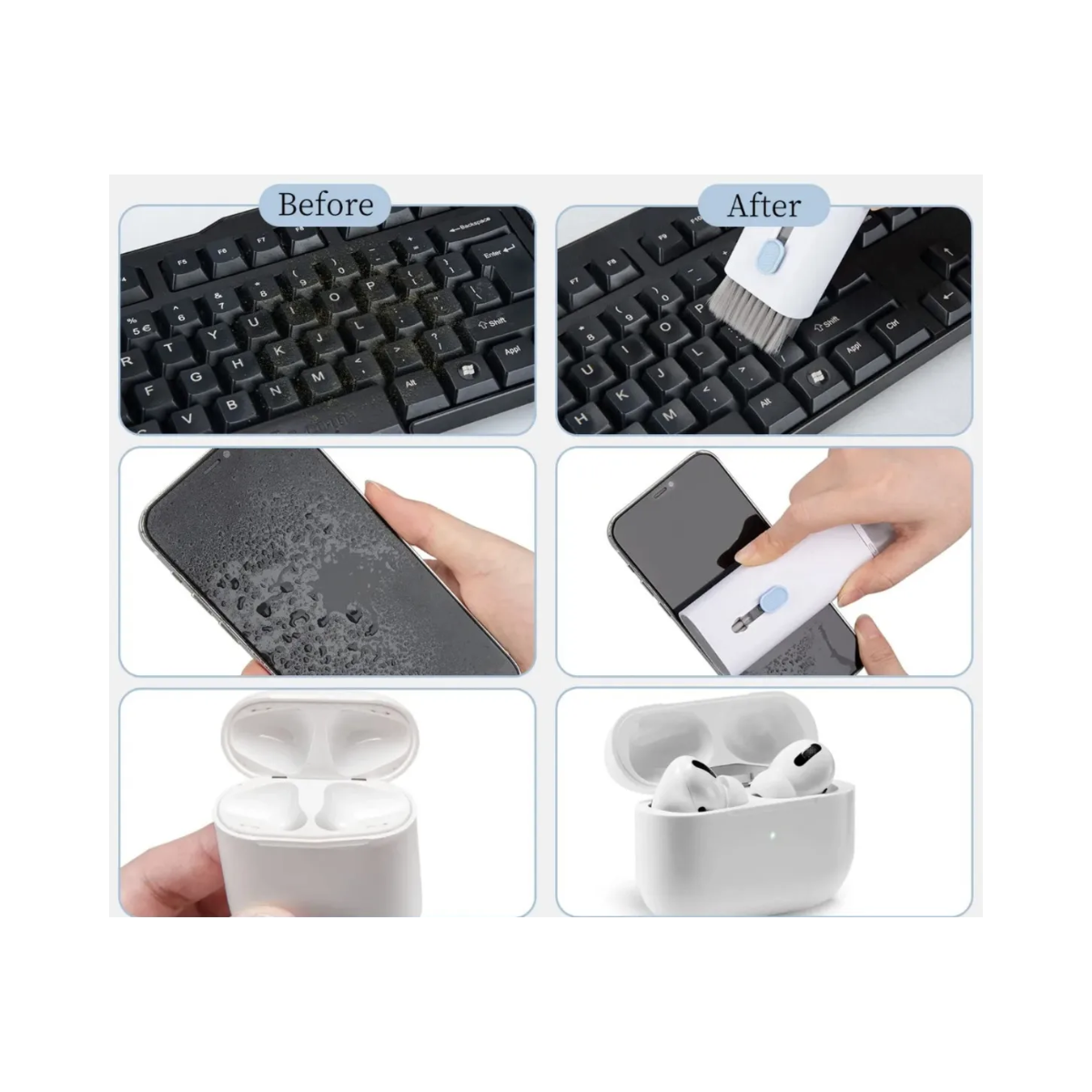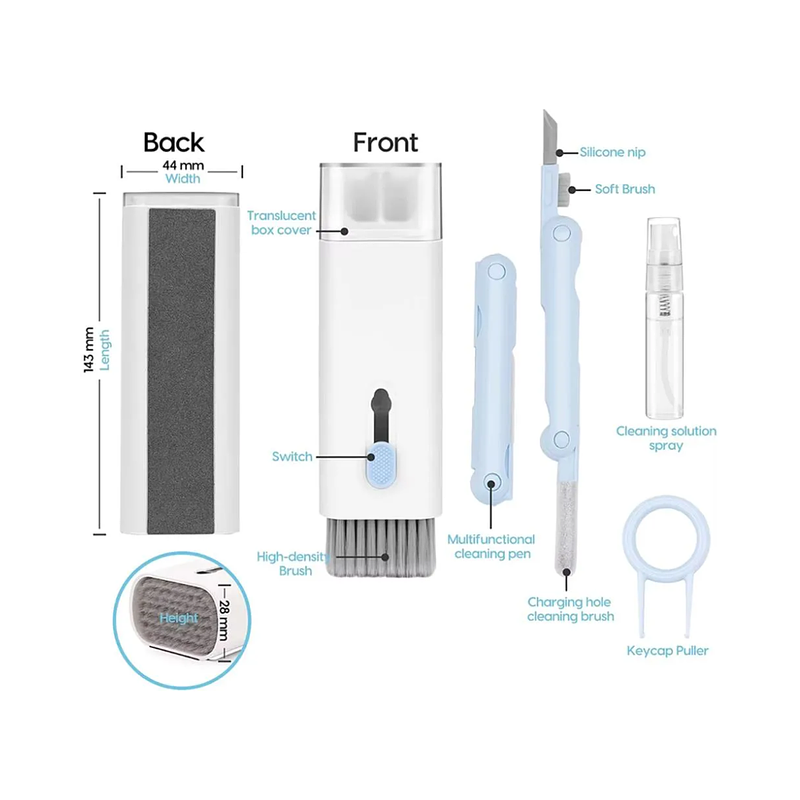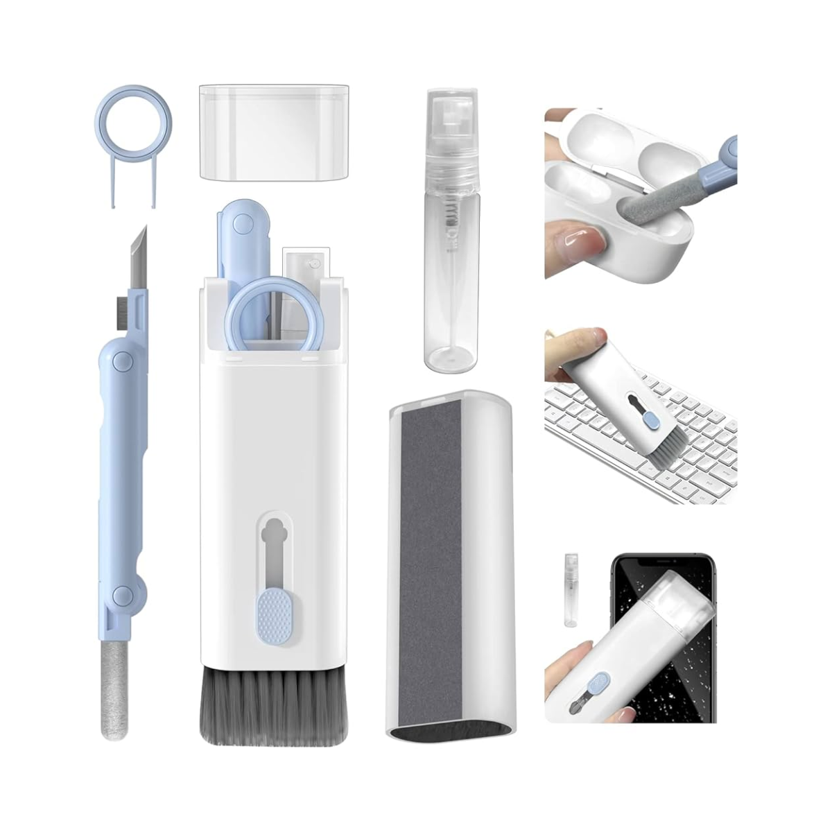 7 en 1: Herramienta de limpieza todo en 1 para laptop y auriculares, incluyendo bolígrafo de limpieza para Airpod con clip de silicona, clip de plástico, esponja flocada y cepillo, spray de solución de limpieza de pantalla, cepillo retráctil de teclado de alta densidad con paño de microfibra, llavero y paño de limpieza de gafas de felpa suave.