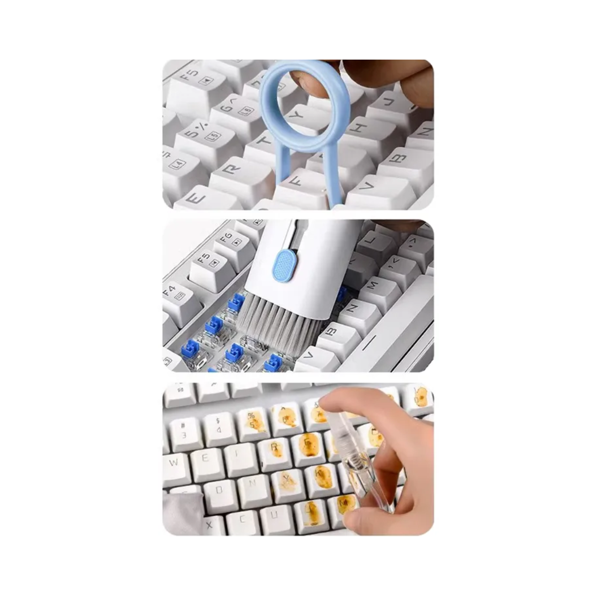 Cepillo retráctil y removedor de llaves: equipado con teclas para limpiar el teclado, lo que te permite limpiar la parte inferior del teclado sin esfuerzo utilizando un simple extractor de teclas. El cepillo de alta densidad es lo suficientemente grande y resistente como para limpiar fácilmente grietas del teclado, escritorios y mucho más.