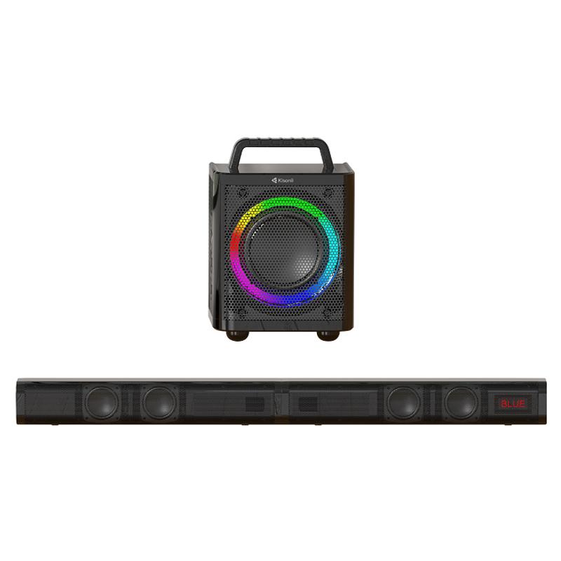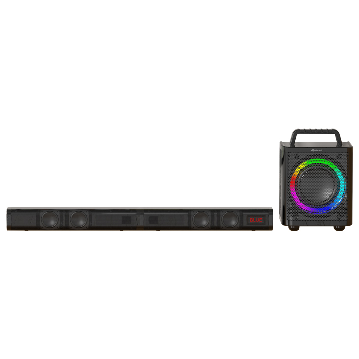Barra de sonido armable con bajo independiente que ofrece un audio potente y envolvente, ideal para mejorar la experiencia en TV y sistemas multimedia. Incorpora múltiples opciones de conexión y efectos de luz RGB para un ambiente más dinámico.