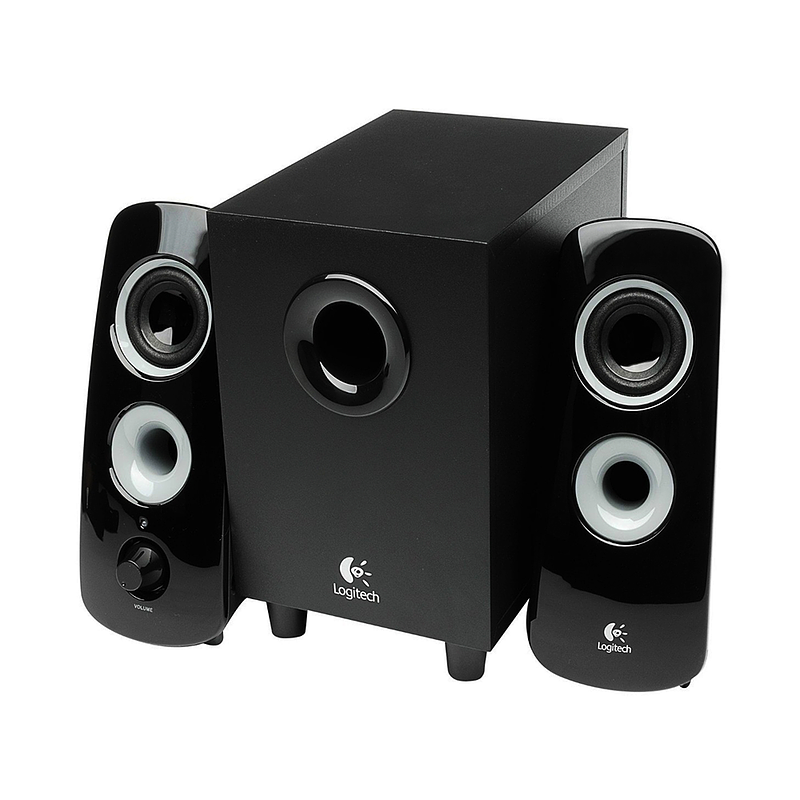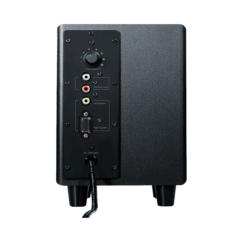 - Controles: controles de encendido y volumen en el altavoz derecho; control de bajos en la parte posterior del subwoofer