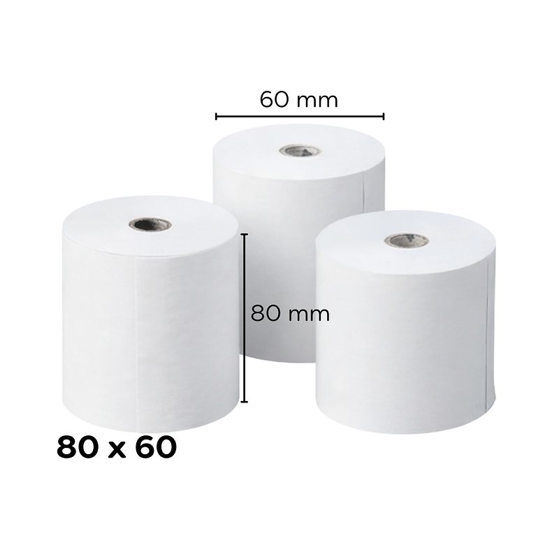 Paquete de 3 rollos térmicos de 80 mm de ancho y 60 metros de largo, ideales para impresoras de tickets, facturas o comprobantes. Compatibles con la mayoría de las cajas registradoras, POS y máquinas de punto de venta.